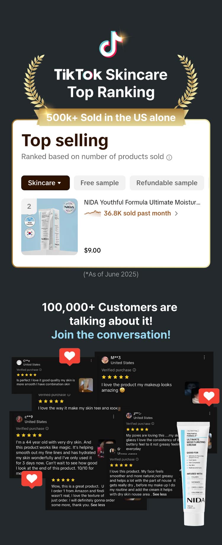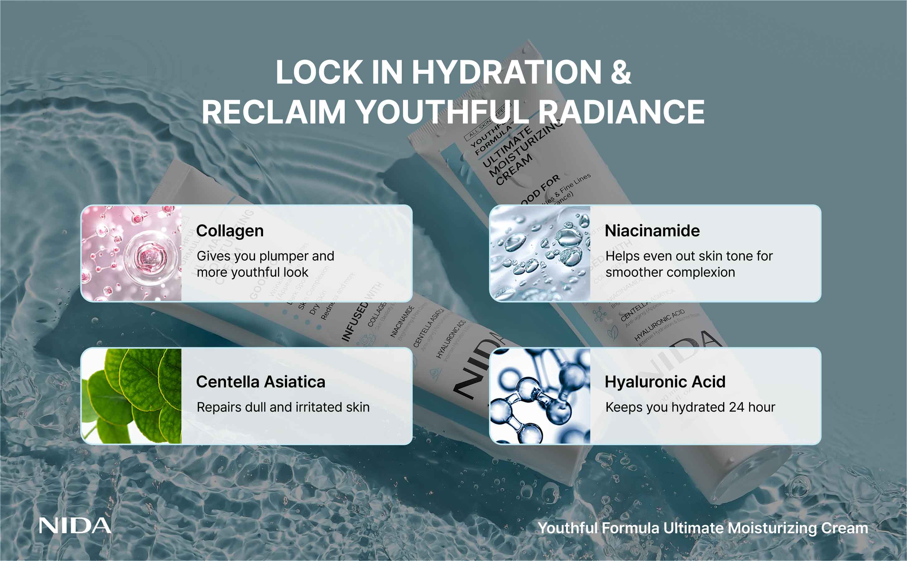 Des milliers de personnes font confiance à la crème hydratante ultime NIDA Youthful Formula pour un éclat frais et sain chaque jour.