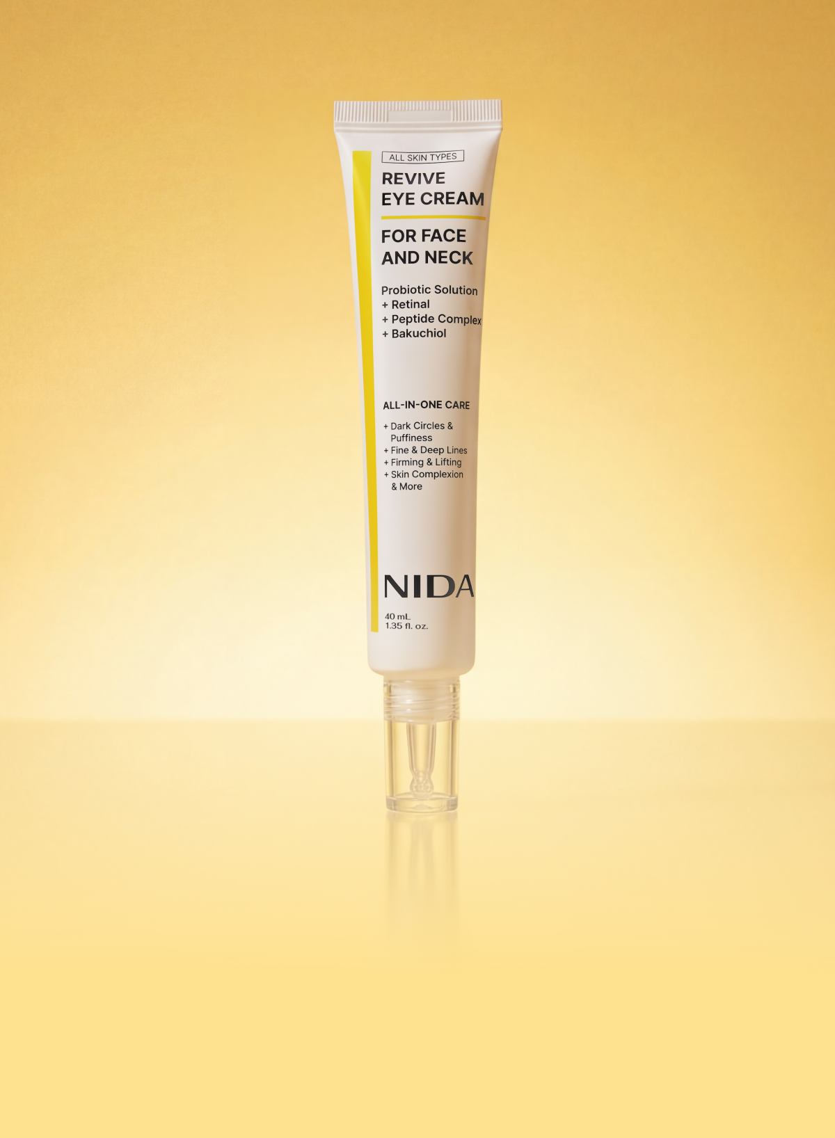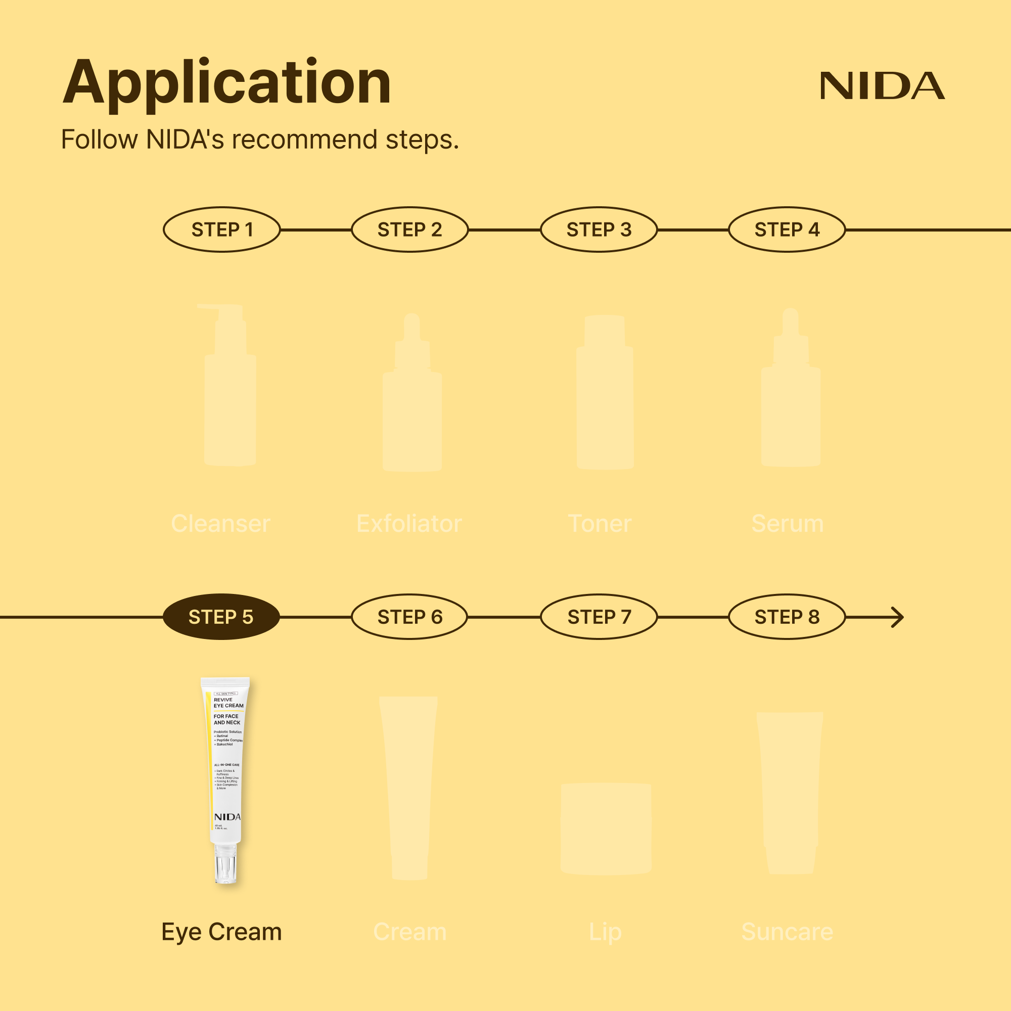 Aplique una pequeña cantidad de crema en el contorno de ojos (rostro) y cuello. Masajee suavemente hasta su absorción. Para obtener mejores resultados, úsela después de aplicar la crema hidratante definitiva NIDA.